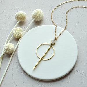 A little lunar magic, no woo required. This necklace features a natural moonstone paired with raw brass—a sleek hoop and rod combo that hits that sweet spot between earthy and architectural. The pendant hangs 2.5" long on a 28" brass link chain, perfect for layering or letting it shine solo.